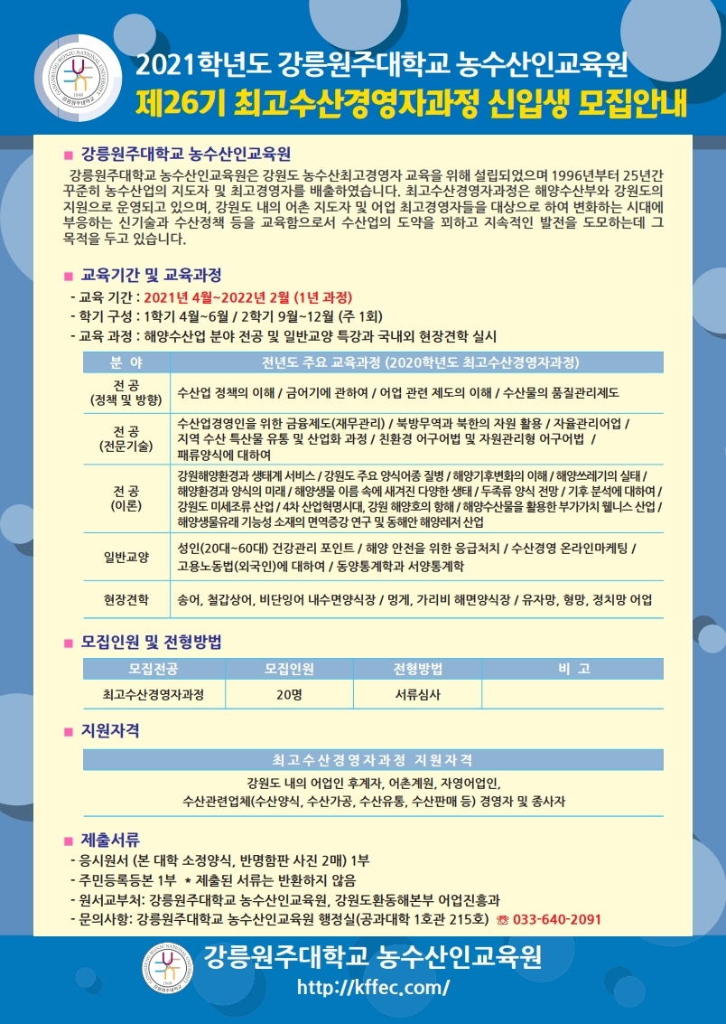 강릉원주대학교 농수산인교육원에서는 수산업의 도약을 꾀하고 지속적인 발전을 도모하기 위하여 2021학년도 제26기 최고수산경영자과정 신입생을 모집하오니 관심있는 수산업 종사자 및 수산업 경영자 분들께서는 신청하시기 바랍니다.