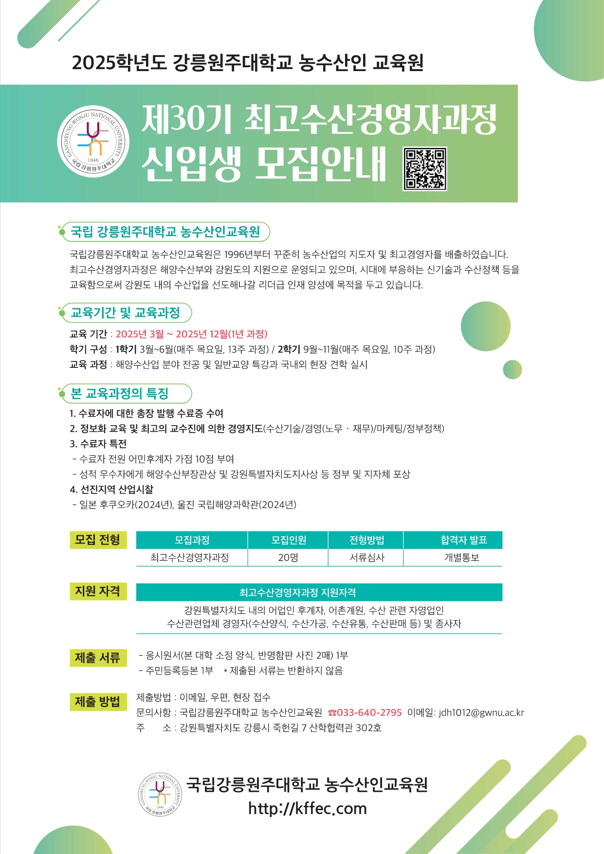 국립강릉원주대학교 농수산인교육원에서는 수산업의 도약을 꾀하고 지속적인 발전을 도모하기 위하여